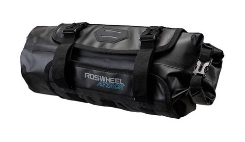Borsello da manubrio di alta qualità per biciclette. Costruzione robusta e impermeabile al 100% con apertura avvolgibile. La camera impermeabile con capacità di 9,4 litri si trova nel supporto esterno con una striscia di velcro. Attacco esterno si attacca al manubrio con cinghie in velcro. Taglie: lungo 59 cm (aperto), diametro del tubo di 15 cm. La parte esterna della custodia nera misura 27,5 cm di larghezza. Peso: 320 g.