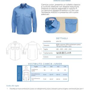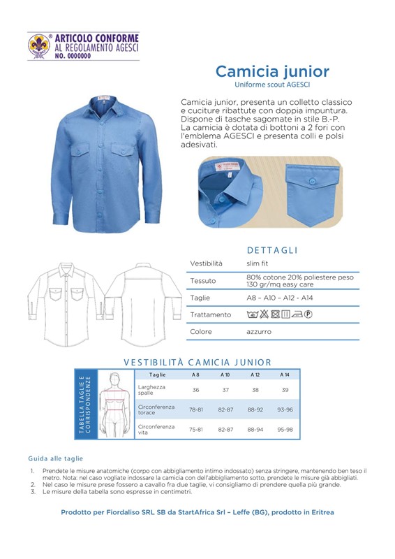 La camicia junior Agesci, adatta per bambini e bambini, come quella da donna e quella da uomo, è realizzata grazie ad un progetto che unisce imprenditorialità e solidarietà da un’azienda italiana (Start Africa), che opera da anni in Eritrea. La camicia junior Agesci è realizzata in cotone (80%) e poliestere (20%). E’ una camicia adatta ai bambini, alle bambini della branca lupetti e coccinelle e ai ragazzi e ragazze dei primi anni della branca esploratori e guide. E’ dal 2005 che la camicia junior dell’uniforme Agesci viene realizzata in Eritrea da un’azienda italiana, Start Africa, che ha fatto rifiorire l’economica locale dando possibilità di lavoro qualificato a oltre 500 persone di cui l’80% sono donne. I salari percepiti dalle donne impiegate sono in media del 10% più alti di quelli che altri lavoratori percepiscono in Eritrea: inoltre, per venire incontro alle necessità delle mamme, sono disponibili sino a 90 posti nell’asilo aziendale e Start Africa assicura anche la scolarizzazione dei bambini delle dipendenti fino al grado più elevato di istruzione presso la scuola italiana di Asmara