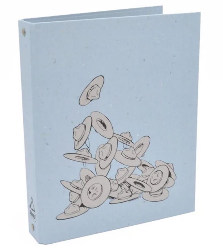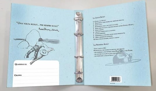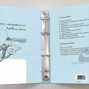 Raccoglitore ad anelli formato to aperto cm 37×22 – 4 anelli diam. 30 mm. All’interno Legge e Promessa Scout e all’esterno copertina con disegno di tanti cappelloni scout.